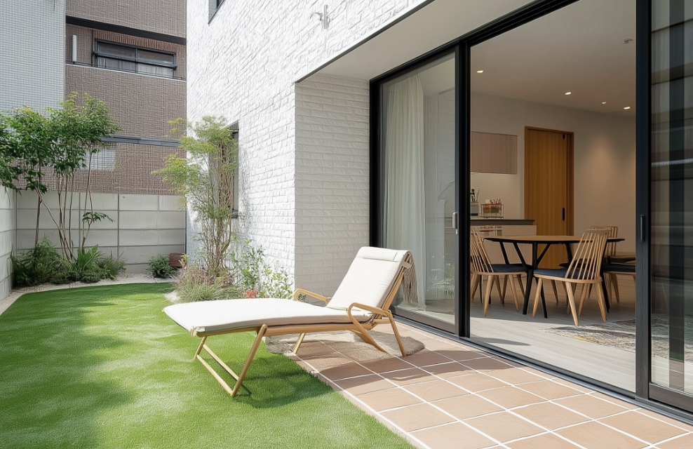 L字型のレイアウトで中庭を囲み、室内のどこにいても緑や風を感じられる設計。