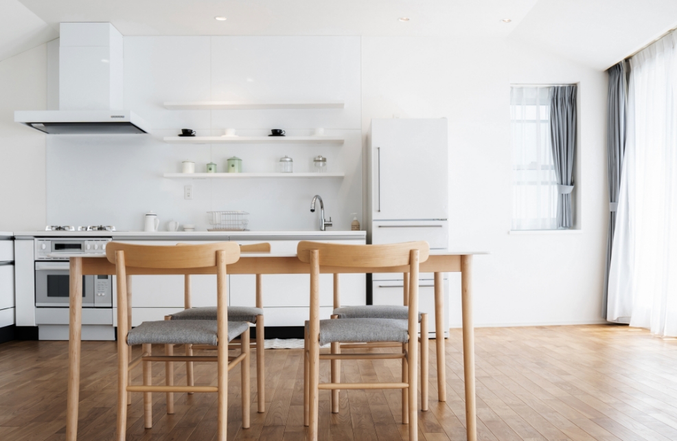 フローリングや造作家具にオーク材を採用。自然な色味と肌触りがやさしい印象に。